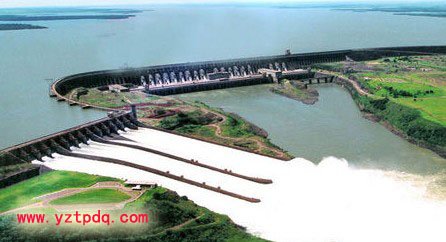 伊泰普水電站位于巴西與巴拉圭之間的界河——巴拉那河(世界第五大河,年徑流量7250億立方米)上,伊瓜蘇市北12公里處,是當(dāng)今世界裝機(jī)容量第二大,發(fā)電量最大的水電站。(裝機(jī)容量最大的是長(zhǎng)江三峽水電站,總裝機(jī)容量將達(dá)到2250萬千瓦,年發(fā)電量為900億度左右。)由巴西與巴拉圭共建,發(fā)電機(jī)組和發(fā)電量由兩國(guó)均分。