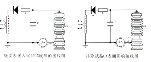 微安表必須有金屬屏蔽,應采用屏蔽與被試品聯(lián)接。高壓引線的屏蔽引出應與儀表端的屏蔽緊密聯(lián)接。如果被試品的表現(xiàn)污穢要排除被試品表面泄漏電流的影響可在被試品高電位端用裸體金屬軟線緊密繞幾圈后與高壓引線的屏蔽相聯(lián)接(見下圖)。