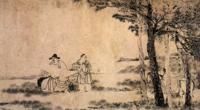在故宮博物院眾多藏品中,有一幅引人注目的《云中送別圖卷》。畫面上一人峨冠溥帶,獨(dú)坐松坡之上,一僮子侍后。兩人手展畫卷,峨冠者凝神而視。樹下一僮子手牽鞍馬,整裝待發(fā)。人物形神兼?zhèn)?,衣紋線條流暢。左方叢林石壁,筆法粗放,墨氣淋漓。這幅兼工帶寫的紙本墨筆畫,收人了《中國繪畫史圖錄》,作者就是明代著名畫家陶成。