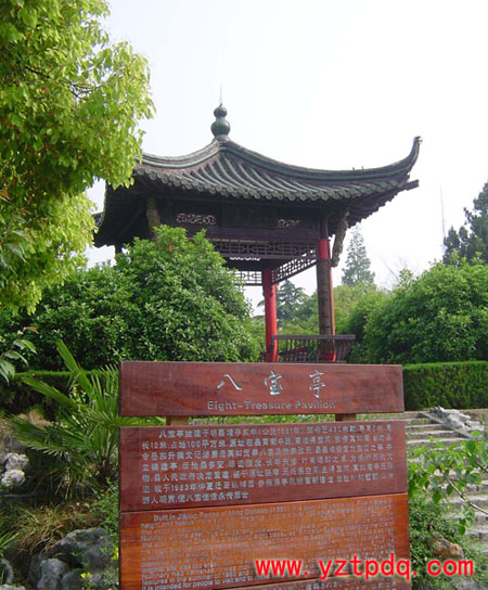 至明朝得寶河淤塞,真如寺傾頹。嘉靖三十年(1551)縣令岳東升見其地云氣殊常,五彩繽紛,命浚得寶河,作記刻碑,建亭護(hù)之,名“八寶亭“。此亭位于縣南街,清代曾兩次重修。1982年,年久失修的八寶亭被拆除,遷建于縱棹園中,趙樸初題額。八寶亭象征著寶應(yīng)得名的由來,朝暉夕陽映其雄姿,風(fēng)花雪月寄其詩情,它總是令人想起真如獻(xiàn)寶大唐轉(zhuǎn)危為安的神奇故事,已經(jīng)成為寶應(yīng)的標(biāo)志性建筑,令中外游客駐足瞻仰浮想聯(lián)翩。