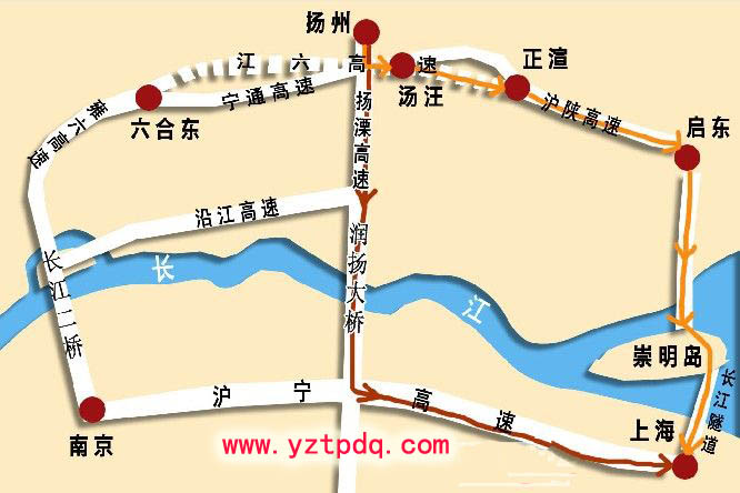 江六高速公路起于揚(yáng)州市江都市仙女鎮(zhèn)正誼互通,與江都至廣陵高速公路順接,然后向西經(jīng)江都市仙女鎮(zhèn),揚(yáng)州市邗江區(qū)、廣陵區(qū)接老寧通公路揚(yáng)州南繞城段湯汪互通處,過蔣王鎮(zhèn)八字橋樞紐互通后經(jīng)儀征市,達(dá)到我市六合區(qū)接雍六高速六合東互通處。