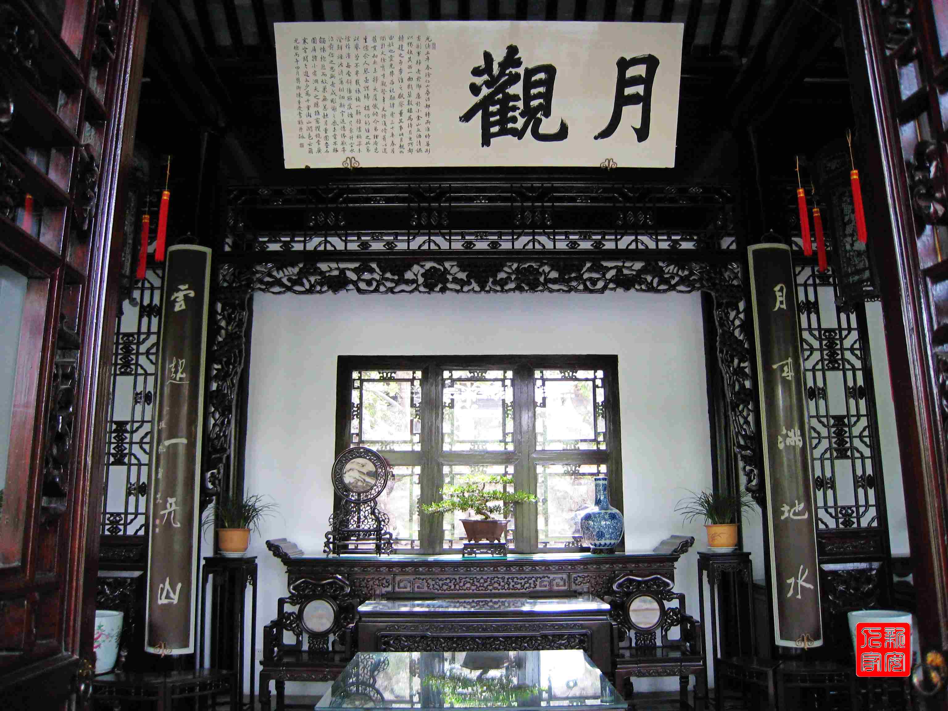 月觀中的海梅家具也很有特點(diǎn),雕刻的內(nèi)容都和賞月有關(guān)。那些蓮花、鴛鴦、荷葉,藕節(jié),無不自然生動,是揚(yáng)州木雕工藝的代表作品。
