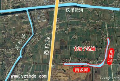 2014年12月4日,江蘇省紅樓夢學(xué)會會員陸守超,根據(jù)衛(wèi)星地圖結(jié)合史料記載,在儀征經(jīng)濟(jì)開發(fā)區(qū)(新城鎮(zhèn)東南)越江村或東升村境內(nèi),發(fā)現(xiàn)疑似古揚(yáng)子縣城的東城河和南城河遺存。古揚(yáng)子縣城就位于當(dāng)中焦莊組、曹莊組和邵莊組一帶。在古揚(yáng)子縣城遺址的東北角還發(fā)現(xiàn)了都天廟遺址。