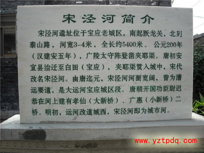 宋涇河,是古運河的一部分,至今已有二千多年的歷史。唐武德四年(621年),安宜縣治遷入白田(即今寶應城)之前,運河從邗溝經射陽湖,沿漢陳登開筑的夾耶貫穿鎮(zhèn)中。隋初又開通了大業(yè)邗溝。