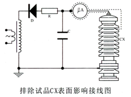 微安表必須有金屬屏蔽,應采用屏蔽與被試品聯(lián)接。高壓引線的屏蔽引出應與儀表端的屏蔽緊密聯(lián)接。如果被試品的表現(xiàn)污穢要排除被試品表面泄漏電流的影響可在被試品高電位端用裸體金屬軟線緊密繞幾圈后與高壓引線的屏蔽相聯(lián)接(見下圖)。