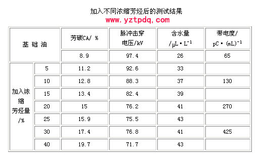 (1) 降低了油的沖擊擊穿強(qiáng)度。工頻擊穿電壓與脈沖擊穿電壓影響因素不同,工頻擊穿電壓值主要受水分、雜質(zhì)等影響,可以通過油處理得到提高;脈沖擊穿強(qiáng)度主要受油組分影響,油中含雜環(huán)芳烴和膠質(zhì)多時,擊穿電壓下降明顯。變壓器,特別是超高壓變壓器,在試驗(yàn)和運(yùn)行中都會遇到不同波形和幅值的沖擊電壓,提高油的耐沖擊強(qiáng)度是有實(shí)用意義的。表2為原克煉基礎(chǔ)油加入不同量的濃縮芳烴后,脈沖擊穿電壓值隨增加量的變化。