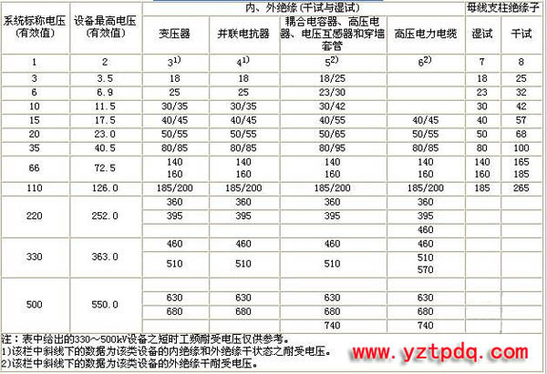 各類設(shè)備短時(shí)(1min)工頻耐受電壓(有效值)表