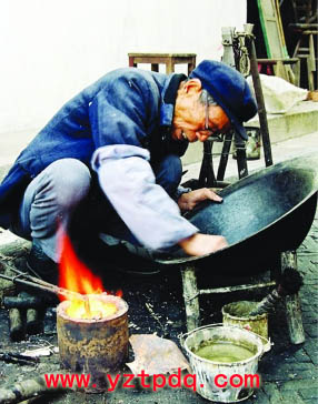 補鍋匠左手拉著風箱,右手提過鍋,放在鋪有草木灰的地上,www.szlezhen.com用一只小巧玲瓏的鐵錘,在要補的四周輕輕地敲打。