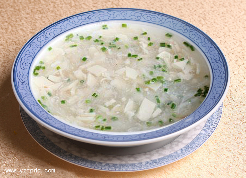 “雪花豆腐”菜名即珠湖雪浪。古代發(fā)明豆腐的是淮南王劉安,關于淮南王做豆腐的傳說很多:一說劉安在安徽淮南八公山上用大豆煉丹,偶然發(fā)現(xiàn)豆?jié){的凝固現(xiàn)象,逐漸試做出豆腐,在禪內秘食,淮南王善于游禪交僧,一日嘗到了和尚們做的豆腐頓覺品味素新,便將豆腐的做法推廣到民間,相傳到各地;還有一說:淮南王劉安非常孝順父母,其母喜吃黃豆,漢高祖十一年時,淮南王的母親生了病,劉安主人把她平時愛吃的黃豆磨成粉,用水沖著喝,并為了調味放入了一些鹽,結果就是出現(xiàn)了蛋白質凝集的現(xiàn)象,劉安的母親吃了很高興,病也是很快好了,于是鹽鹵點豆腐的技術便流傳下來。而首創(chuàng)“雪花豆腐”的是揚州高郵人,所以高郵的“雪花豆腐”風味獨特。加工切成的豆腐塊細如飛雪,如珠湖之浪花,它鮮美、香甜、細嫩、光滑、舒適、暖胃,食后回味留連,越吃越想吃。藝術大師劉海粟曾為其題詞:“其味無窮”。