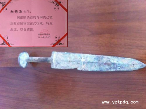 經(jīng)高郵、揚(yáng)州兩地文物考古專家初步鑒定,該劍系商周時代的青銅古劍。