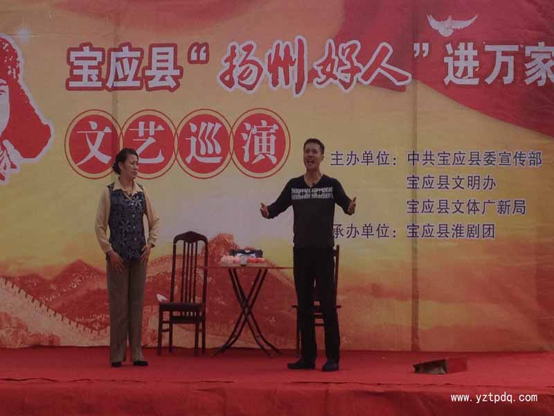 寶應(yīng)縣淮劇團(tuán)的演員們以農(nóng)民朋友喜聞樂見的淮劇形式,展現(xiàn)了愛崗敬業(yè)馬小梅、36年如一日照顧特殘軍人丈夫?qū)O云鳳、十年四救落水者的平民英雄張志成、用孝行和大愛撐起整個(gè)家的李順梅以及視腦癱小姑子如親妹、待多病的婆婆勝似親媽蔣長鳳等5位“揚(yáng)州好人”的風(fēng)采。他們精彩的演出博得了現(xiàn)場觀眾的陣陣掌聲。全鎮(zhèn)近千名群眾觀看了演出,通過文藝巡演傳遞了正能量,弘揚(yáng)了新風(fēng)尚。