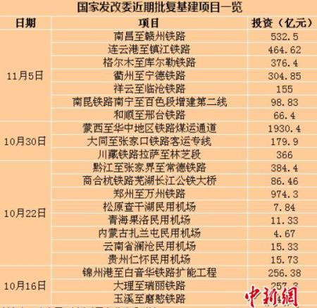 至此,在10月16日到11月5日的21天時間里,發(fā)改委至少批復(fù)了上述16條鐵路和5個機場項目,這21個基建項目總投資約6933.74億元。