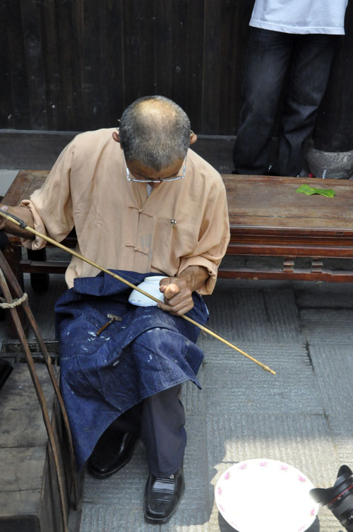 日常使用陶瓷器很普及,因此各地都能看到補(bǔ)碗匠,他們一般沒有固定的攤位,挑一副簡易擔(dān)子,內(nèi)存必要的工具和材料,走街穿巷攬生意做,從那“補(bǔ)碗哦,補(bǔ)碗哦……”吆喝的長腔中,你能發(fā)覺他們不是本地人。操此營生的,以江西老表居多,景德鎮(zhèn)是我國著名的瓷都,產(chǎn)量豐富,由此衍生出“補(bǔ)碗”行業(yè)也是很自然的事情。有一句歇后語:江西人補(bǔ)碗——自顧自,即是從補(bǔ)碗鉆孔時(shí)發(fā)出的“口茲口茲”有節(jié)奏的聲響引發(fā)的,它似乎沒有譏諷老表的意思,而是抨擊自私自利的行為。隨著補(bǔ)碗行當(dāng)?shù)南?,這句歇后語也已淡出江湖。補(bǔ)碗匠大多身懷絕技,小到酒杯,大到幾個(gè)人合抱不過來的醬缸,他們都有本領(lǐng)使之“完璧”。有些人家,祖?zhèn)鞯恼滟F瓷器有了裂紋,未雨綢繆,預(yù)先給“補(bǔ)”起來;而尋常人家,生活節(jié)儉,只要“補(bǔ)”比買新的便宜,一只破碗他們都不舍得丟棄,湊合著補(bǔ)一補(bǔ)再用。當(dāng)然,如今可不這樣了,瓷器磕破了,一扔了之,誰也不會(huì)想到去“補(bǔ)”。
