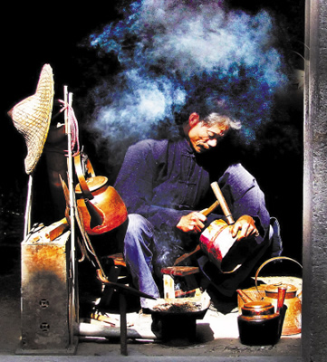 老揚(yáng)州人家都喜歡銅器,那時(shí)候,一般家庭所使用的器皿都離不開銅器,婚嫁時(shí)必備兩個(gè)銅盆,子孫滿月又要送個(gè)銅盆、一雙銅筷子,父母過六十大壽,子女照例會送上一個(gè)銅盆,寓意父母金盆洗手可以享清福了。以前揚(yáng)州一帶人家以擁有銅器為榮,使用銅器多的便是大戶人家。但到了“大躍進(jìn)”大煉鋼鐵時(shí),人們紛紛把銅器捐了出來,銅器從此在日常生活中“淡出”,銅器鋪相繼關(guān)門,可銅匠擔(dān)仍然活躍在街頭巷尾。